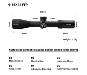 Innovative Reticle: The AP4 4-16X44 FFP reticle that enhances target identification and improves precision during aiming. This reticle design provides clear, easy-to-read reference points for range and windage, enabling faster, more accurate shots�whether you’re training for precision shooting or hunting in varying conditions.