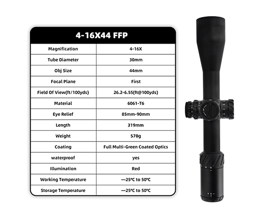 Stylish Appearance: With a sleek, modern design, the AP4 4-16X44 FFP not only offers top-tier performance but also a stylish, rugged look that complements any rifle. Its clean lines and matte finish make it an attractive addition to your gear.